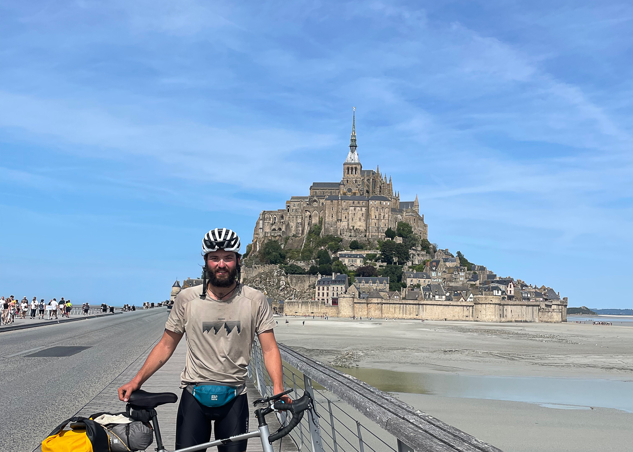 Je commence mon voyage avec mon vélo, prêt à traverser l’Europe. Les routes sont calmes et le soleil brille…